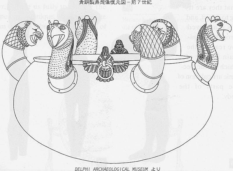 『DELPHI ARCHAEOLOGICAL MUSEUM』は、東方様式の奉献品は、新たな鼎のタイプ、おそらく北シリア地域を起源とするものに取って代わった。鎚打ちの大鍋は持ち運ぶことができ、縦溝飾りのある三本の脚に支えられた輪っかに載せた。縁の周りは、牡牛、ライオン、そしてもっとよくあるグリフィンやセイレンのような想像上の動物で飾ったという。